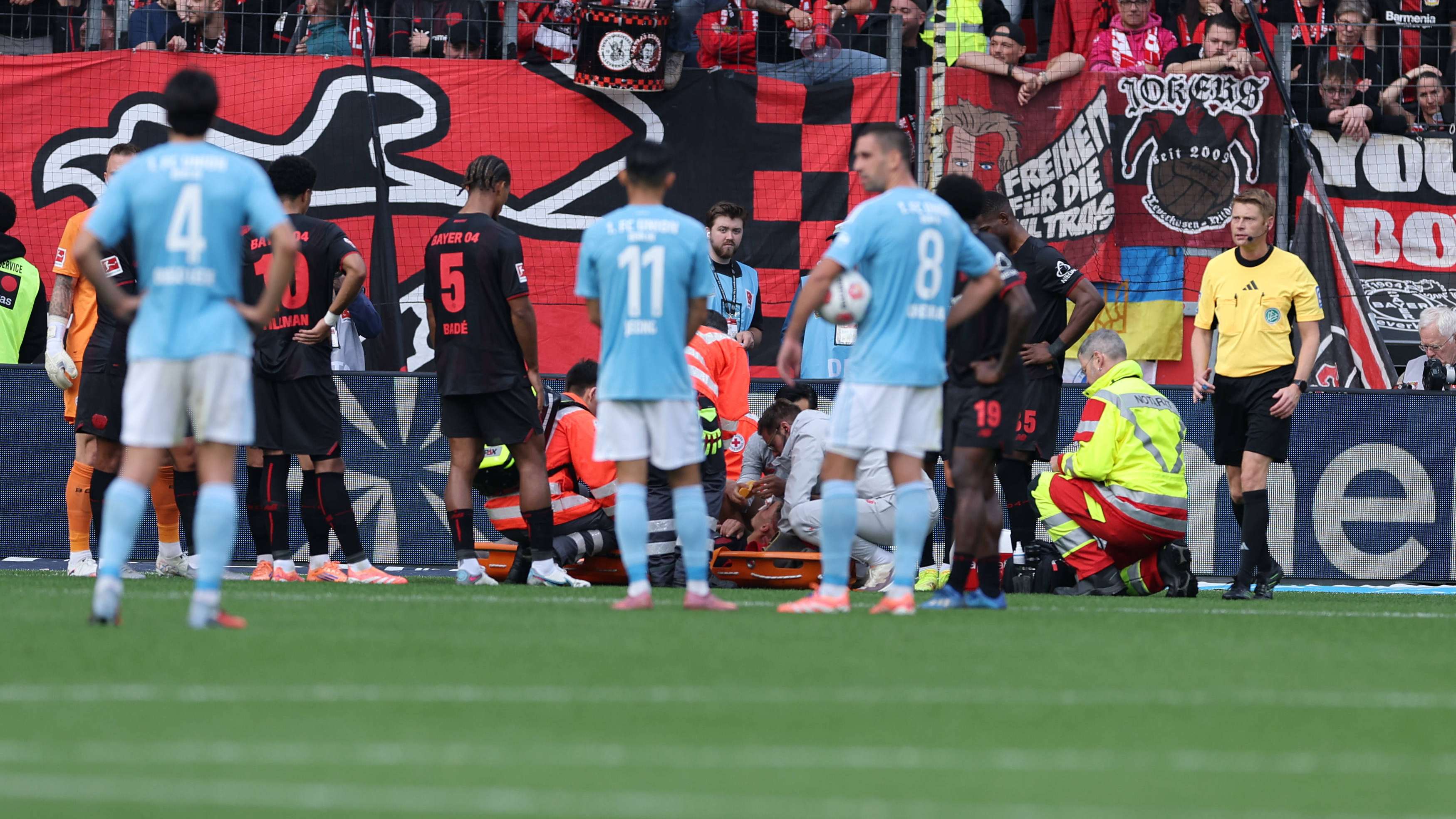 Grimaldo valt hard en blijft roerloos liggen, teamgenoten Leverkusen vormen direct cirkel Voetbalzone