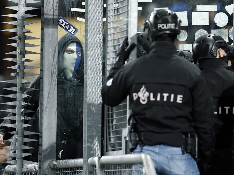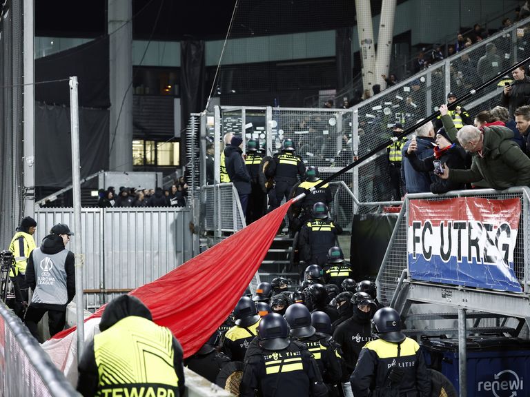 ME veegt uitvak leeg voor Europees duel Utrecht, Genk spreekt van 'buitensporig geweld'De aftrap in Utrecht is uitgesteld naar 21.50 uur vanwege onrust in en rond het vak met supporters van KRC Genk. NOS23-01-26 | 08:01